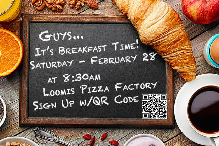 February 28 @ 8:30 am - 10:00 am Men’s Breakfast – February 28 – 8:30am – 10:00am Join us for our quarterly BREAKFAST at the Loomis Pizza Factory.