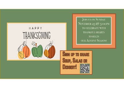 Sunday November 23 at 5:00 Sign up to bring Soup, Salad or Dessert